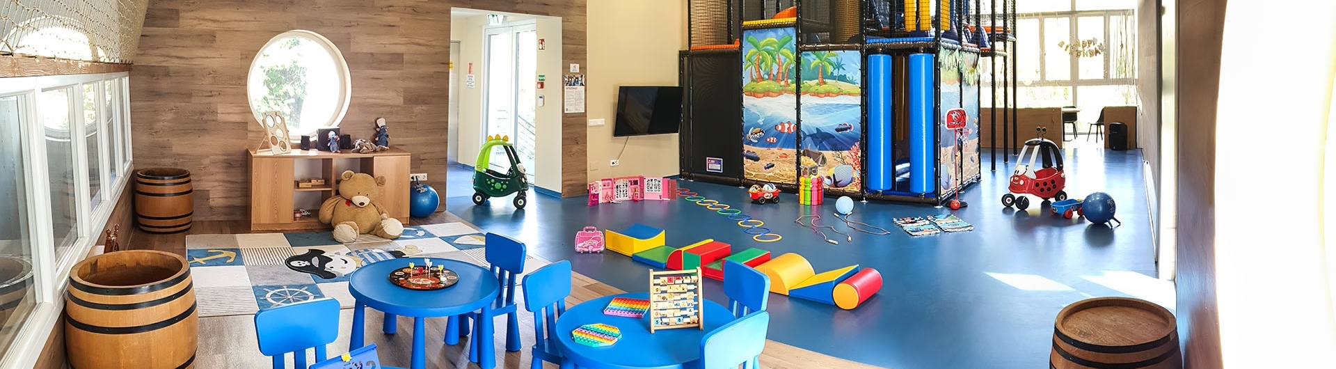 (1) Az első részen, a Kalózhajó fedélzetén sok érdekes játék várja a kicsinyeket hangulatos környezetben. (2) A Játszóház közepén található egy csúszdát és mozgást ösztönző elemeket tartalmazó nagy játékelem. (3) Végül pedig a nagy üvegfelület mellett található a Kalóz tanácsterem egy hosszú asztallal, székekkel.